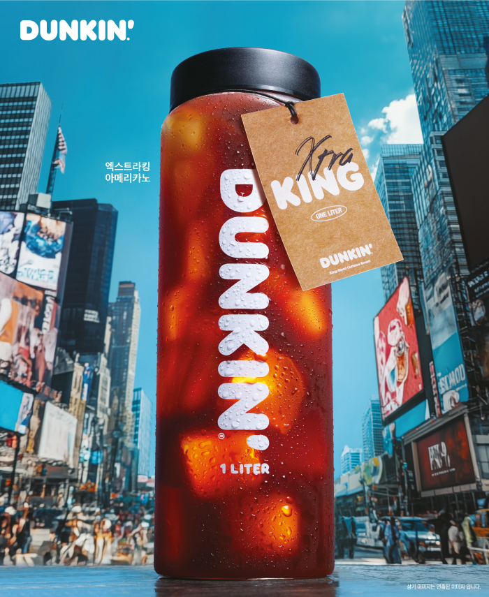 던킨은 앞서 선보인 대용량 커피 ‘킹사이즈 아이스 아메리카노’의 누적 판매량이 140만 잔을 돌파하고, 전년 동기 대비 판매량 126%를 달성하는 등 대용량 음료가 지속 인기를 끄는 추세를 반영해 1L 사이즈의 초대용량 커피를 추가로 선보이게 됐다.