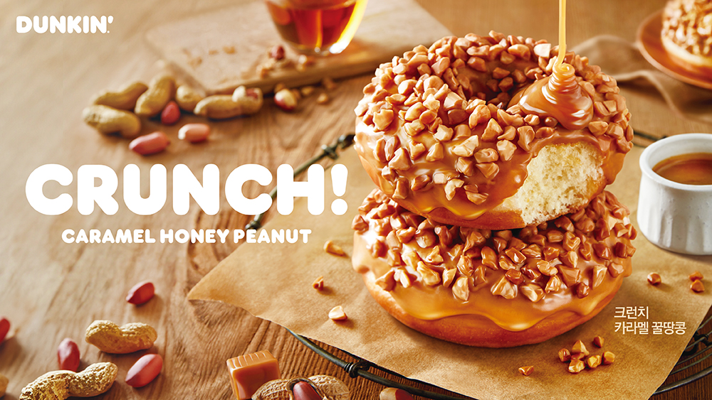 ‘크런치 카라멜 꿀땅콩’은 카라멜 코팅을 한 링 도넛에 꿀이 코팅된 땅콩을 듬뿍 올려 먹음직스러운 비주얼이 돋보인다. 카라멜과 꿀의 달콤함과 땅콩 본연의 고소한 맛은 물론 땅콩 원물이 오도독 씹히는 크런치한 식감까지 느낄 수 있다.