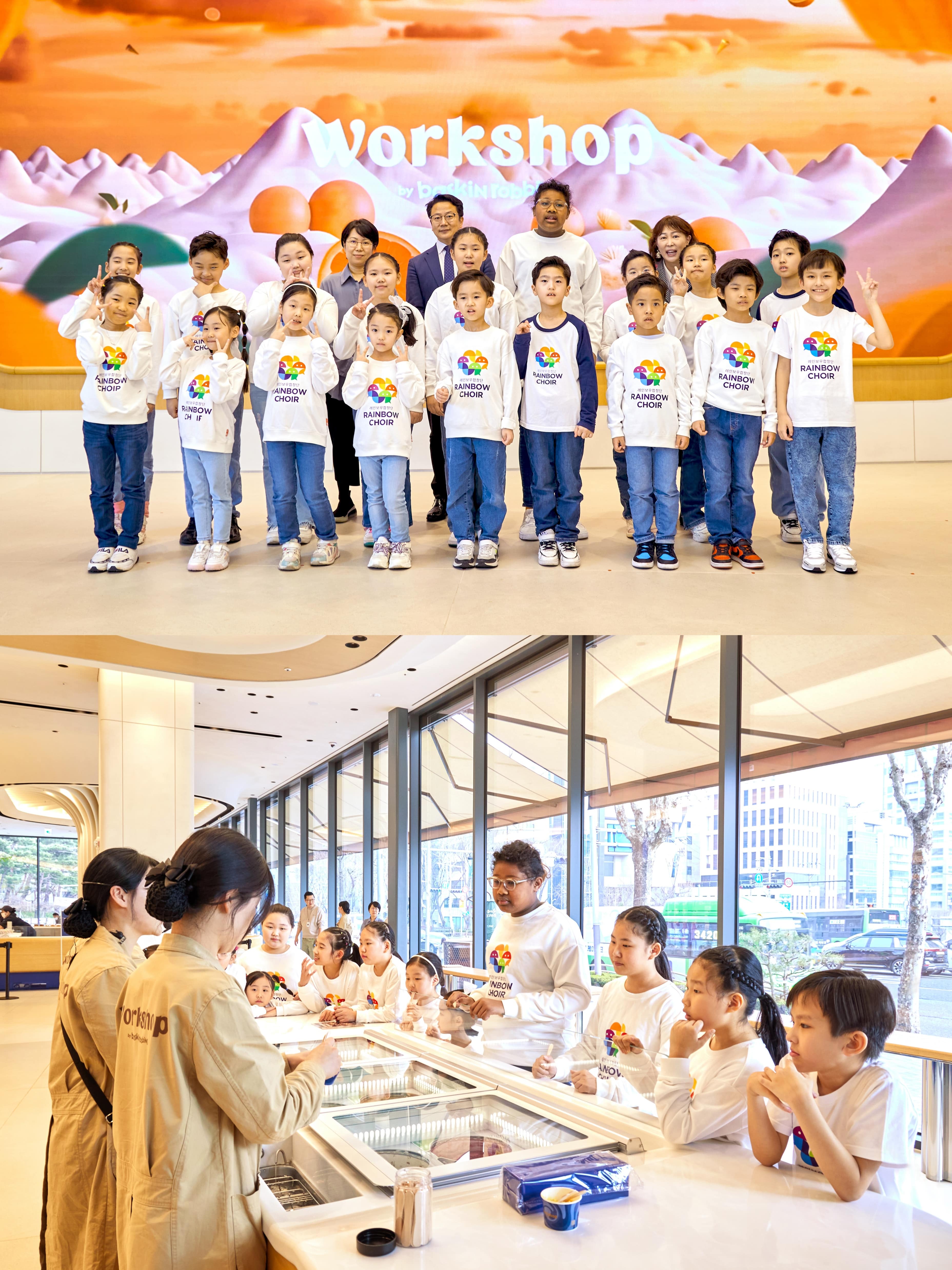 [상단 이미지] 29일 '레인보우합창단'의 '워크샵 바이 배스킨라빈스' 방문을 기념해 배스킨라빈스 마케팅전략실 김나영 실장(뒷 줄 왼쪽 1번째), SPC해피봉사단 백승훈 상무(뒷 줄 왼쪽 2번째), 레인보우합창단 장미아 단장(뒷 줄 왼쪽 4번째)이 어린이 단원들과 함께 기념촬영을 하고 있다. [하단 이미지] '레인보우합창단' 어린이 단원들이 '워크샵 바이 배스킨라빈스'의 브랜드 스토리텔러 닥터가 진행하는 아이스크림 도슨트 프로그램에 참여하고 있다.