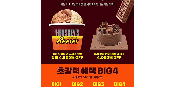 12월 1, 2, 3일 총 3일간 진행되는 ‘배라데이’는 12월 이달의 맛 ‘아이스 허쉬 앤 리세스’를 대상으로 다양한 혜택을 제공한다. 신제품 ‘아이스 허쉬 앤 리세스’는 글로벌 초콜릿 브랜드 ‘허쉬(HERSHEY’S)’, 허쉬의 피넛버터 브랜드 ‘리세스(REESE’S)’와 협업해 탄생한 제품으로 겨울 시즌에 어울리는 깊고 진한 달콤함을 선사한다.