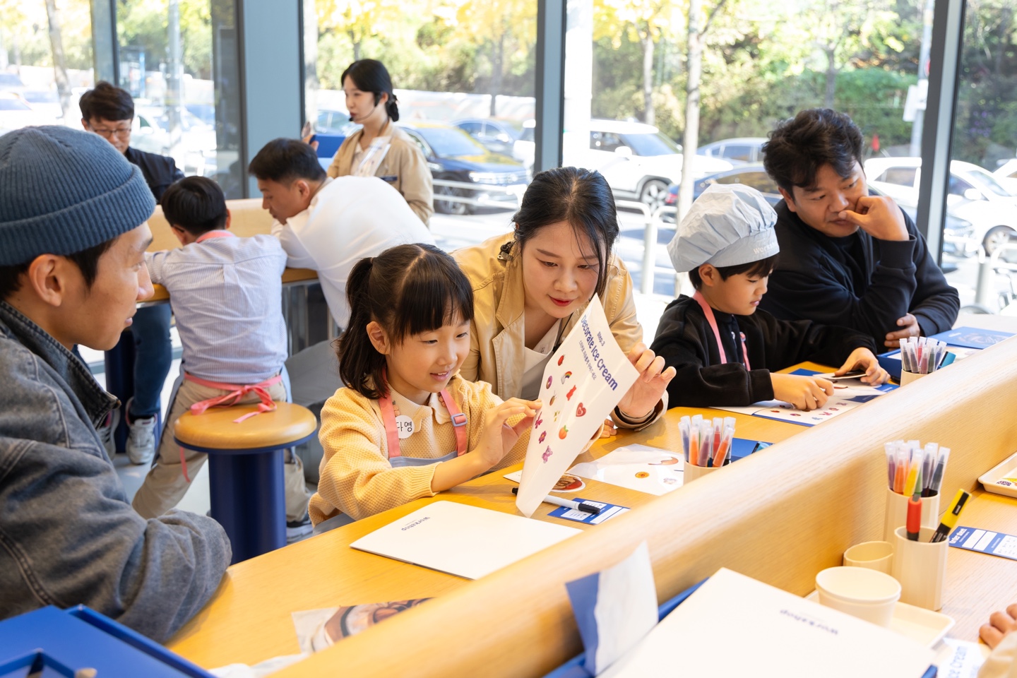 9일 소방의 날을 맞아 ‘워크샵 바이 배스킨라빈스’ 매장의 패밀리 도슨트 프로그램에 초청된 소방 공무원 가족들이 브랜드 스토리텔러와 함께 아이스크림 디자인 체험 활동을 하고 있다.