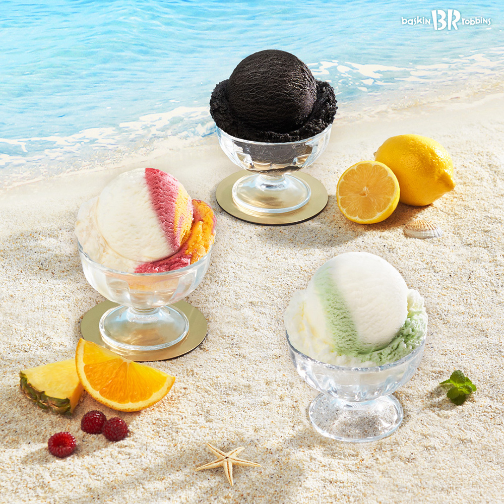 ‘블랙 소르베’는 검은색의 레몬 라임맛 소르베(Sorbet, 얼린 과일로 만든 디저트의 일종) 아이스크림으로, 상큼한 레몬 라임 맛과 시원한 소르베의 식감, 고정관념을 깨는 이색 컬러가 반전 매력을 선사한다. ‘애플민트’는 청사과 샤베트와 민트 아이스크림이 조화를 이뤄 깔끔하고 청량한 맛이 특징이다. 이와 함께, 배스킨라빈스 스테디셀러 ‘레인보우 샤베트’도 파인애플, 라즈베리, 오렌지 세 가지 과일을 한 번에 즐길 수 있는 시원한 맛으로 여름을 대표하는 플레이버 중 하나로 꼽히고 있다.