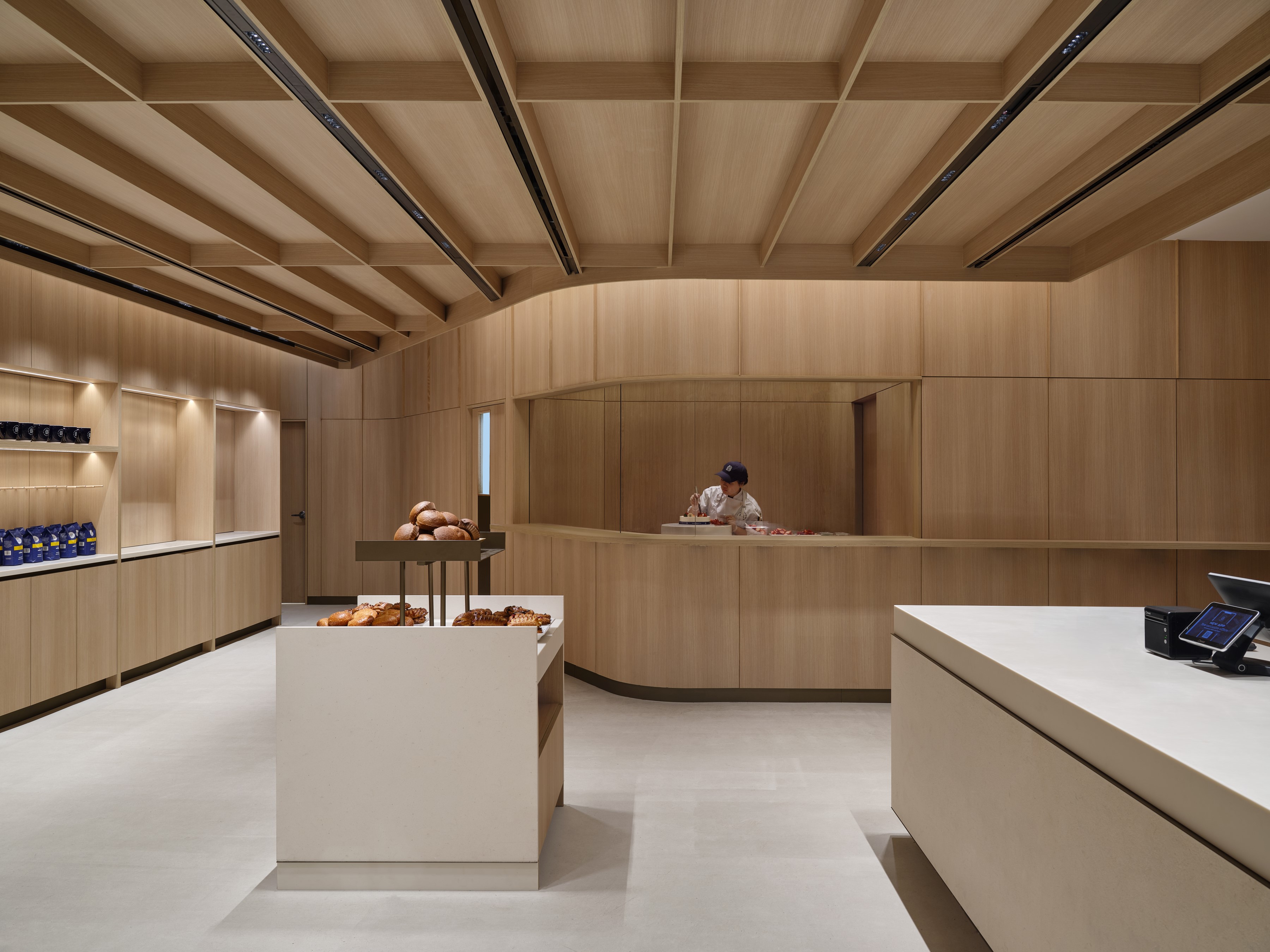 캐내디언 인테리어스는 “한국적인 정서인 ‘정(情, Jeong) 을 콘셉트로 하여 단순한 기능적 디자인을 넘어 따뜻한 감각을 경험할 수 있도록 디자인했다. 화이트 오크와 라임스톤으로 구성된 공간 디자인은 빵의 주원료인 밀과 곡물의 색감을 은유적으로 담아냈다. 은은한 조명 아래 유리로 둘러싸인 곡선형 키친 공간에서 파티시에들이 케이크를 장식하는 모습이 고객에게 볼거리를 제공한다”라고 평했다.