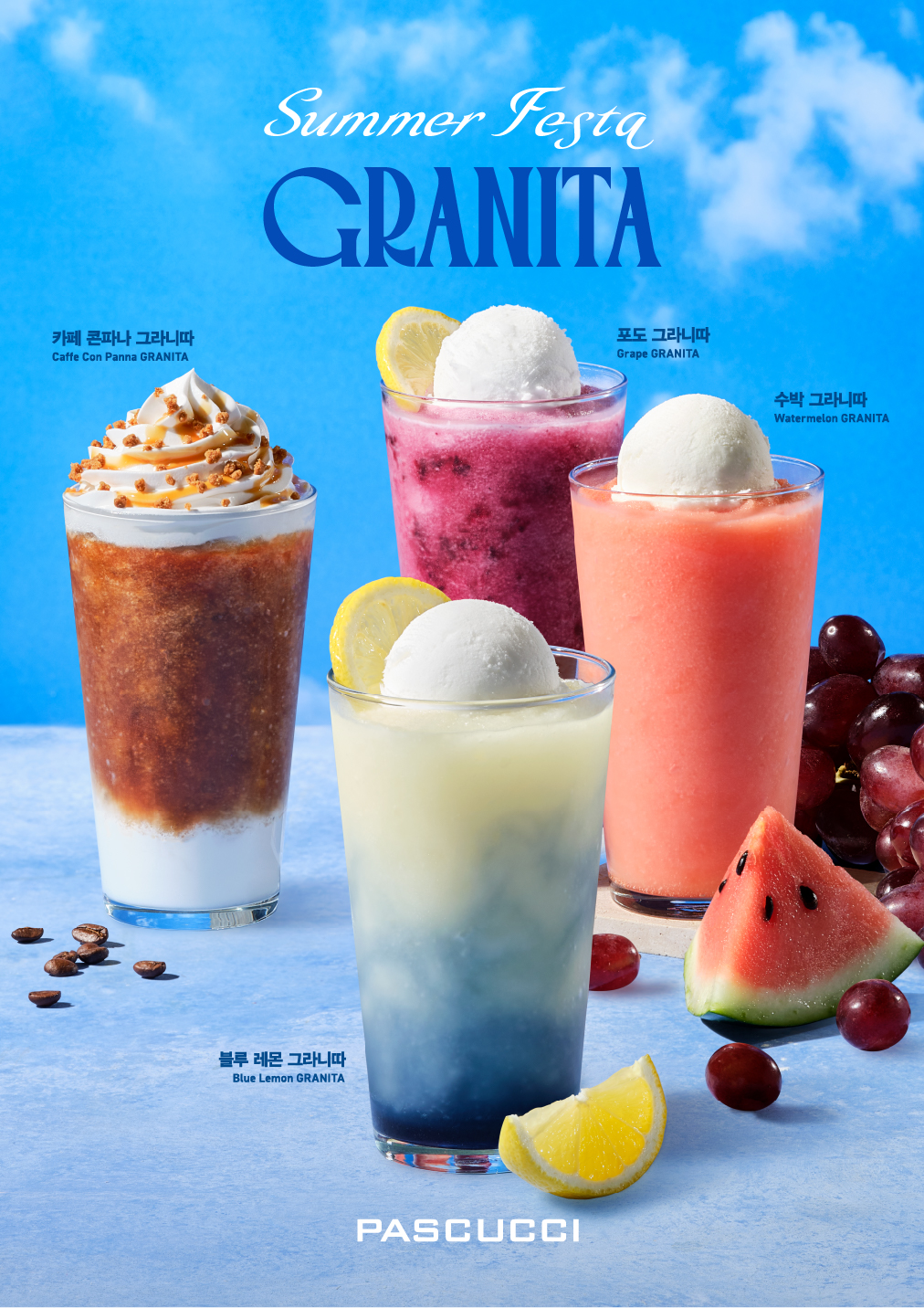 신제품은 ‘서머 페스타 그라니따(Summer Festa Granita)’를 콘셉트로 이탈리아의 시원한 여름 디저트를 다채로운 색과 맛으로 선보인다. 파스쿠찌의 대표 디저트인 ‘그라니따 (Granita)’는 이탈리아어로 ‘얼음을 부수다’라는 뜻으로 덥고 습한 시칠리아섬에서 유래했다. 얼음 알갱이로 이루어진 모습이 화강암(Granite)을 닮아 ‘그라니따’라고 불리게 됐다.
