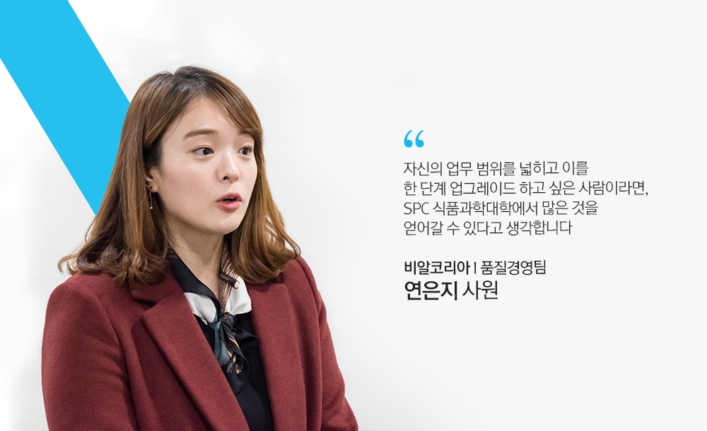 이태우 과장: 제가 SPC와 인연을 맺은지도 벌써 20년이 넘었습니다. 더 멀리 앞으로 나아가기 위해서는 재도약이 필요한 시점이라고 여겨지던 차에, 사내외 교수진으로 구성된 SPC 식품과학대학의 전문적인 교육 커리큘럼이라면 도전해볼 만하다고 생각했습니다.