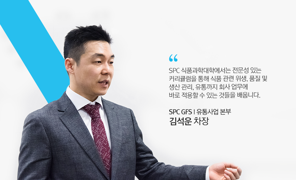 김석운 차장: SPC 식품과학대학에는 서로 다른 계열사에서 온 사람들이 모여 함께 공부합니다. 평소에는 만나기 힘든 동료들을 만날 기회도 얻고, 서로 정보도 공유할 수 있다는 것이 SPC 식품과학대학에서 공부하면서 얻을 수 있는 장점 중의 하나인 것 같습니다. 그리고 학위를 취득할 수 있다는 점도 배움에 대한 열정이 있는 임직원이라면 누구나 도전해볼 만한 이유인 것 같습니다.