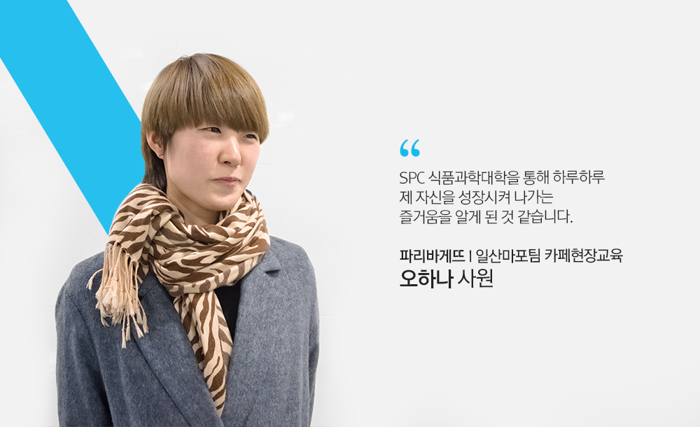오하나 사원: 공부를 하면 할수록 더 공부하고 싶은 것들이 생기는 것 같습니다. 제 전문 분야인 커피 공부도 꾸준히 하면서 경영학도 추가로 공부할 예정입니다. SPC 식품과학대학을 통해 하루하루 제 자신을 성장시켜 나가는 즐거움을 알게 된 것 같습니다.