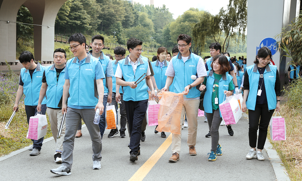 기념 축사와 기념사진 촬영까지 마치고, 본격적으로 환경보호 활동이 시작되었습니다. 팀을 나누어 쓰레기봉투와 집게, 그리고 인근 주민들에게 나눠줄 머그컵을 들고 임직원들은 양재천과 인근 지역을 청소하는 것으로 창립기념식을 마쳤습니다.