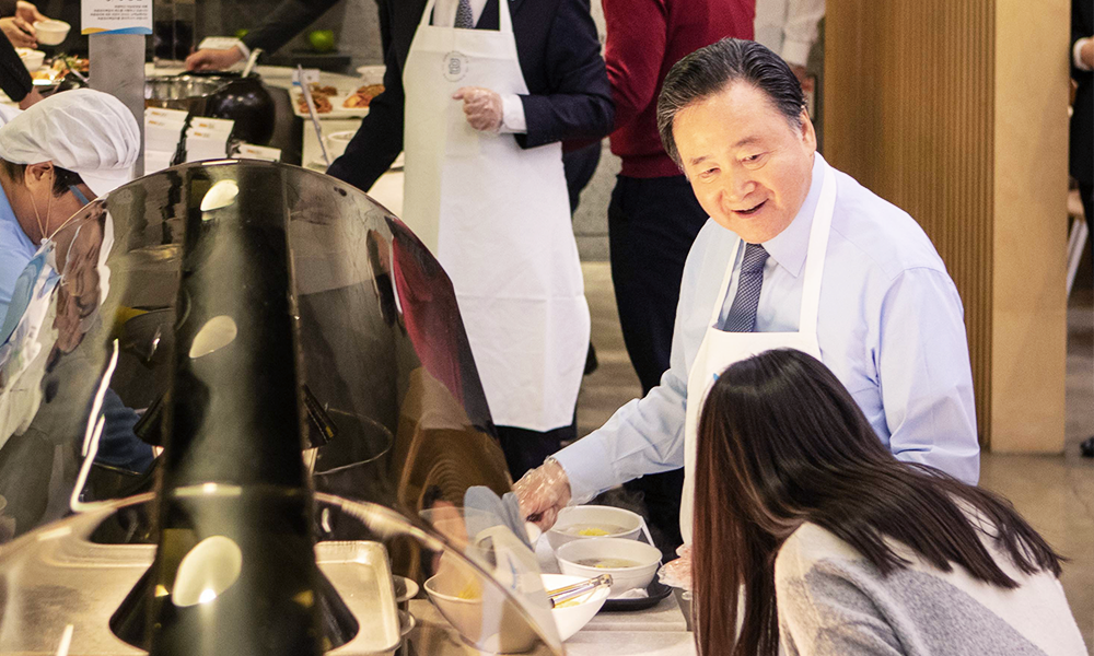 신년식이 끝나고 양재사옥 지하1층 구내식당에서는 깜짝 이벤트가 열렸습니다. 허영인 회장과 대표이사들이 임직원들에게 직접 떡국 배식을 하는 이벤트가 진행됐는데요. 새해를 맞이하여 허영인 회장은 임직원들과 더욱 가깝게 소통하는 시간을 가졌습니다.