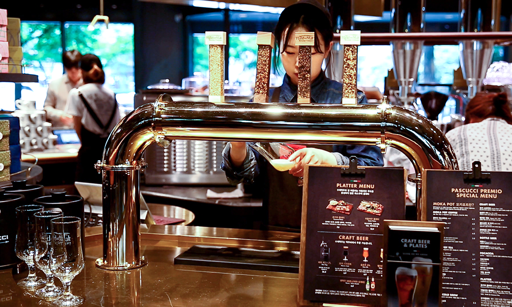 카페에선 커피만 마신다? 파스쿠찌 역삼테헤란점에서는 시원한 맥주까지 즐길 수 있습니다. 낮에는 커피, 밤에는 맥주를 마시는 ‘낮커밤맥’(‘낮에는 커피, 밤에는 맥주’의 줄임말) 트렌드 콘셉트를 적용한 것인데요. 기존 일부 파스쿠찌 매장에서 판매하던 이탈리아 맥주 2종과 수제 맥주 전문업체인 핸드 앤 몰트 수제 맥주 3종을 함께 판매하고 있습니다.