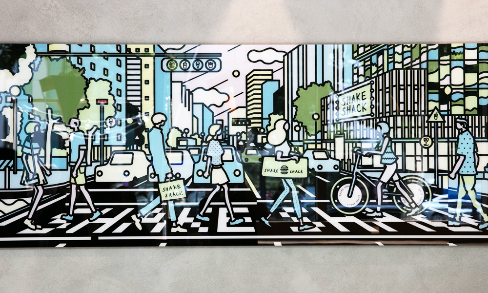 매장 곳곳에 국내외 고객들의 눈길을 사로잡는 디자인 요소를 사용한 것도 큰 특징입니다. 매장 외부에는 한국 전통적인 패턴인 조각보와 기와를 연상시키는 인테리어로 매장을 연출했고, 내부에는 팝아트&일러스트 작가 ‘베릴(VERIL)’과 협업한 작품도 색다른 매력으로 매장의 분위기를 살려주고 있었습니다. 이 작품은 종로의 과거와 현재, 미래의 순간을 재치 있게 담은 ‘씨티팝(City Pop)’ 으로 쉐이크쉑 종각점의 활기찬 분위기를 표현함과 동시에 매장의 밝은 분위기를 이끄는 요소로 작용하고 있습니다.