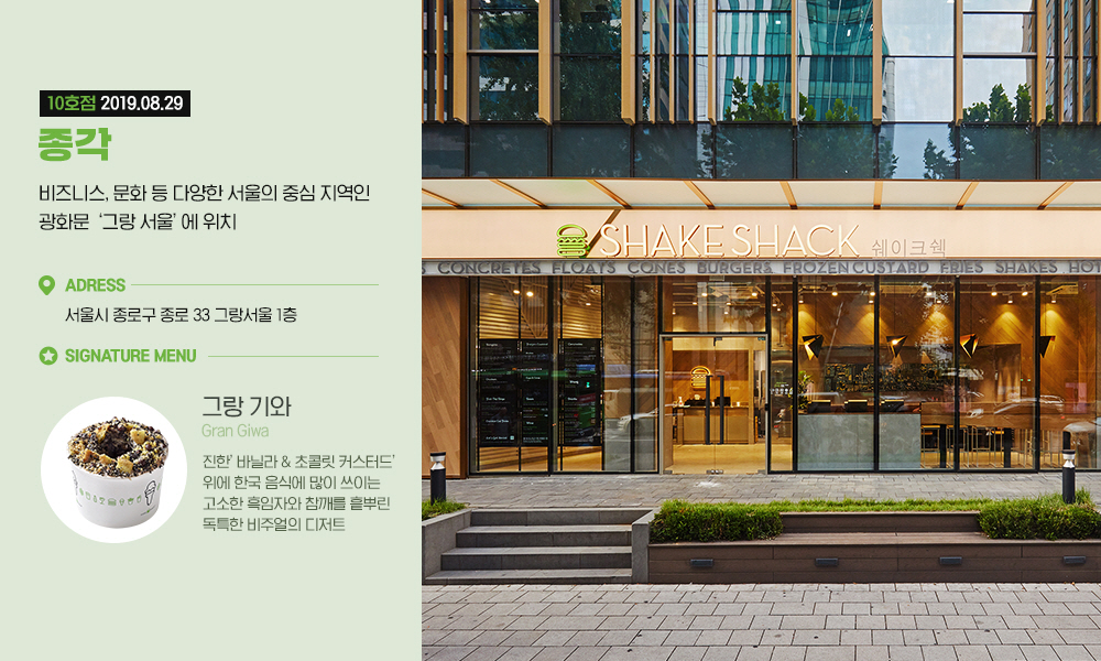 여름의 끝자락인 8월 29일 드디어 쉐이크쉑 10호점이 개점했습니다. 이번 10호점은 서울의 중심, 광화문에 위치한 ‘그랑서울’ 1층에 위치하고 있는데요. 종각점에 위치한 그랑서울은 광화문, 종로 일대의 새로운 랜드마크로 떠오른 곳이라고 알려지기도 하죠. 도심 속 자리 잡은 쉐이크쉑의 개점 행사에는 어떤 일들이 있었는지, 10호점 종각점만의 매력은 어떤 것들이 있는지 함께 살펴볼까요?