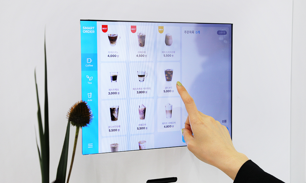 SPC 네트웍스는 카페 운영에 특화된 UX(User Experience, 사용자 경험)와 UI(User Interface, 이용자 인터페이스)를 기반으로 한 IT 솔루션을 제공하고 있습니다. SPC네트웍스의 부스는 안드로이드 태블릿 기반의 소형 키오스크가 배치되어 있었는데요. 주문, 접수, 대기번호 출력, 대기번호 문자 접수까지 한번에 진행되어 소비자와 근무자 모두 편리한 시스템이 구축되어 있었습니다. 특히 키오스크를 사용하지 않을 때는 유명 작품 사진들을 표출하는 액자식 인테리어 느낌을 구현해 매장 미관을 해치지 않도록 고려했습니다.