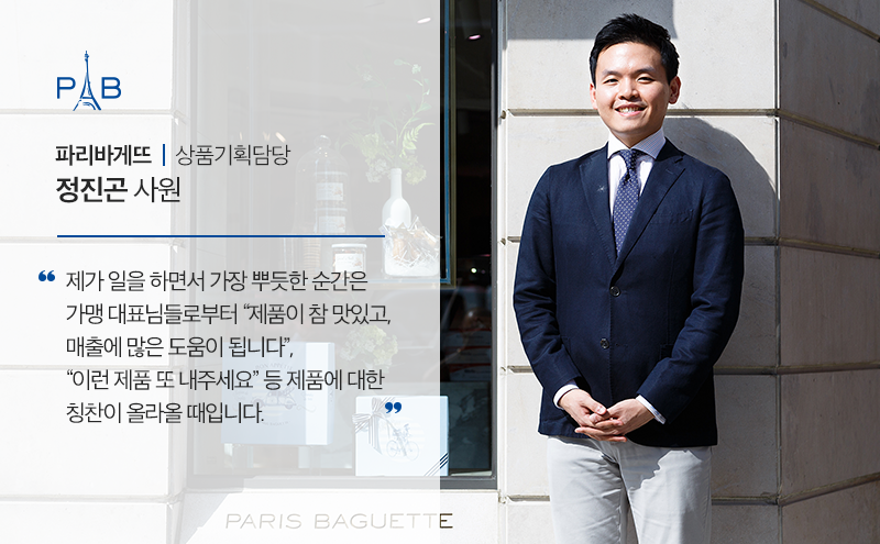 파리바게뜨 마케팅 정진곤 사원입니다. 현재 파리바게뜨 브레드 제품 중 ‘유럽빵’과 ‘일반휴면반죽’ 제품을 담당하는 PM (Product Manager)으로서, 제품 출시 및 매출관리 업무를 맡고 있습니다.