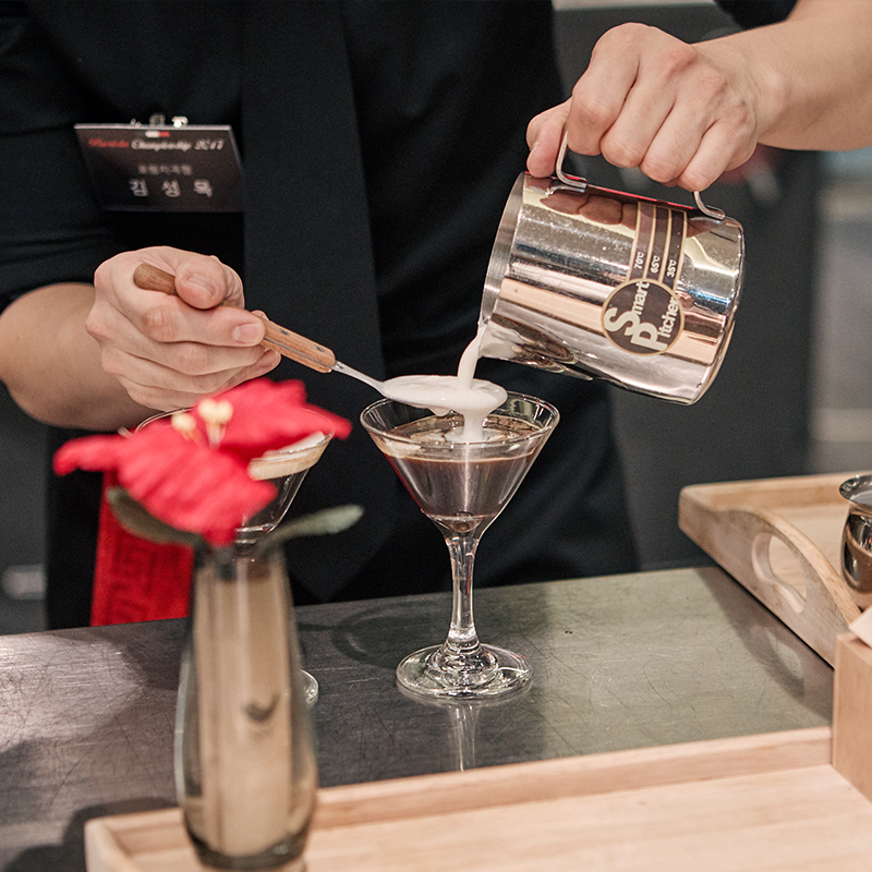 김나희 바리스타는 미지근한 물에 우려낸 티베이스와 온도가 3℃ 낮은 에스프레소를 혼합한 뒤 질소를 주입한 커피를 선보였습니다. 플라워 아로마를 머금은 잔을 준비해 더욱 로맨틱한 커피향을 느낄 수 있었습니다. 관능 포인트는 다크 초콜릿, 오렌지의 화사한 풍미, 미디움 바디입니다.