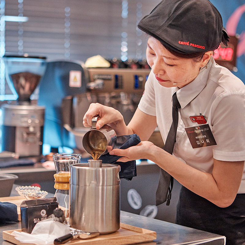 지난 11월 6일, 파스쿠찌 서울대점에서 ‘파스쿠찌 바리스타 챔피언십 2017 결승전’이 열렸습니다. 이번 대회에는 총 172명의 파스쿠찌 바리스타가 선수로 출전했으며, 이 중 예선과 본선 경연을 통과한 6명의 바리스타(직영점 3명, 가맹점 3명)가 결승전에 진출했습니다. 파스쿠찌 바리스타들이 커피 문화로 함께 교류하며, 파스쿠치노(Pascuccino, 파스쿠찌 인이라는 뜻의 이탈리아어)의 자긍심을 한껏 고취시킨, 그 대회 현장의 모습을 소개합니다.