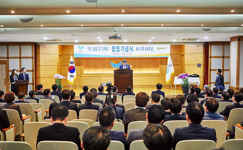 한편, 같은 날 오후 SPC삼립 시화 공장에서는 SPC삼립 72주년과 샤니 45주년 창립기념식이 진행되었습니다. 장기근속 대리점 및 사원 대표 9명, 우수 가맹 대리점 및 사원 대표 4명에 대한 시상식이 이루어졌습니다. 뒤이어 SPC삼립의 새로운 목표, ‘2020 비전’을 발표하는 시간을 가졌습니다. 마지막으로 전 임직원이 함께하는 구호제창과 다과회를 끝으로 창립기념식은 막을 내렸습니다.