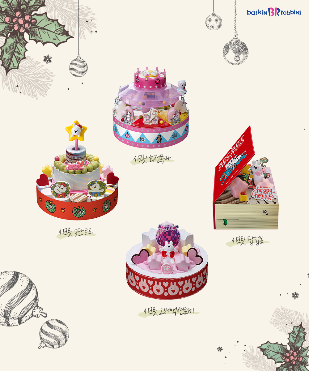 배스킨라빈스는 시크릿 크리스마스를 주제로 달콤한 아이스크림에 돌리고, 펼치고, 뽑으며 케이크의 숨겨진 비밀을 찾는 놀이요소까지 더한 것이 특징인데요. 케이크 위의 꼬마 곰 피규어를 잡고 돌리면 회전목마가 돌아가면서 숨겨져 있던 초코볼이 떨어지도록 만든 ‘시크릿 회전목마’, 케이크 중앙의 별 모양 토끼 피규어를 잡고 올리면 3단 입체 트리 케이크가 완성되는 ‘시크릿 3단 트리’, 6가지 맛 케이크를 덮고 있는 책 표지 모양을 펼치면 크리스마스 팝업 카드가 나타나는 ‘시크릿 팝업북’, 모자처럼 착용할 수 있는 오버액션토끼 뚜껑을 덮은 ‘시크릿 오버액션토끼’을 포함한 아이스크림 케이크 26종을 출시했습니다.